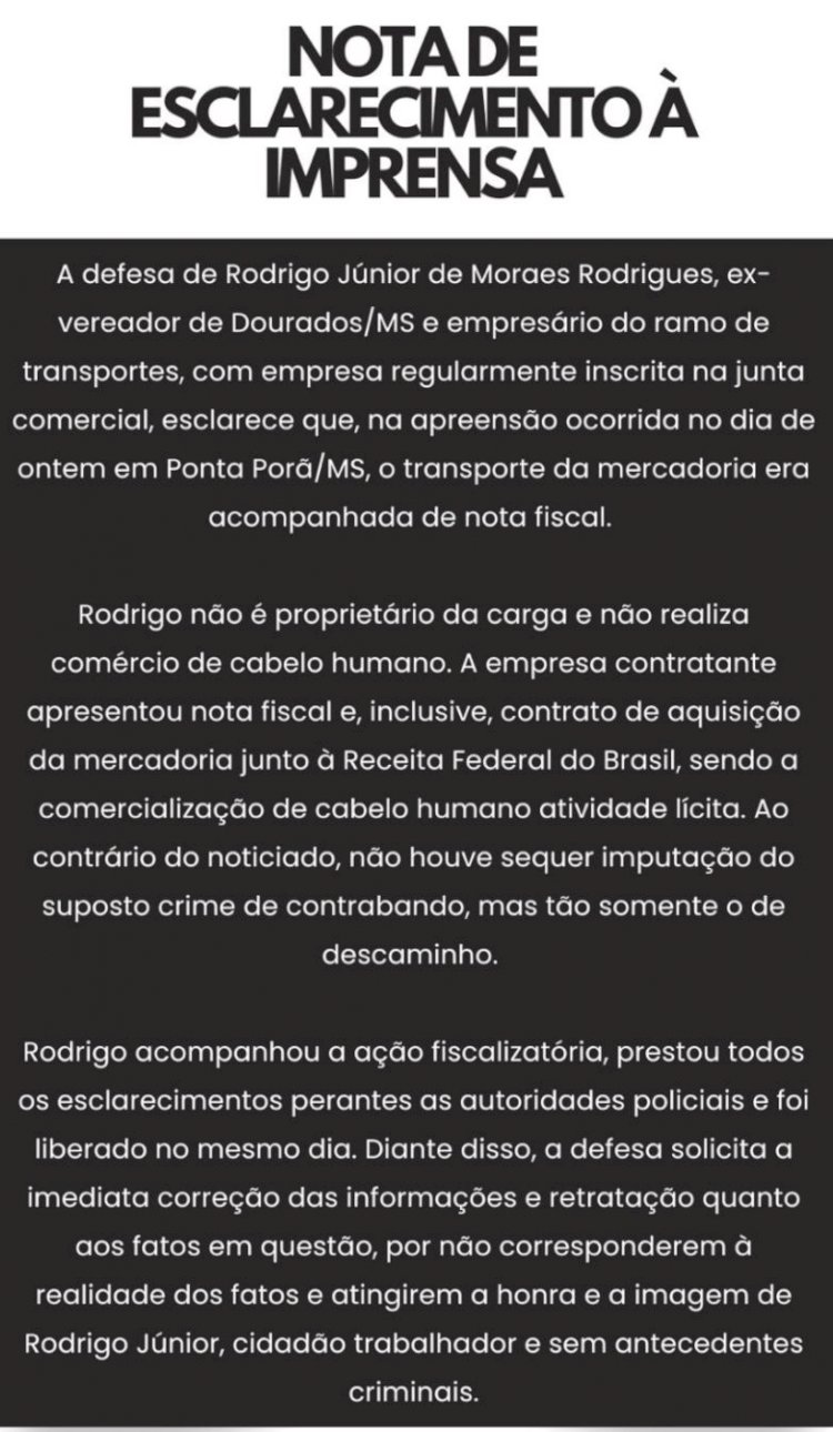 Rodrigo Junior de Morais Rodrigues, ex-vereador de Dourados (MS), foi detido no último domingo (30) após policiais do DOF encontrarem 257 kg de cabelo humano escondidos dentro do veículo que ele conduzia na MS-164, em Ponta Porã. A carga, avaliada em cerca de R$ 2,5 milhões, estava distribuída em fardos ocultos no automóvel.