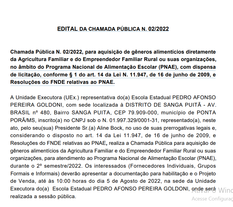 organizações, para atendimento ao Programa Nacional de Alimentação Escolar (PNAE),