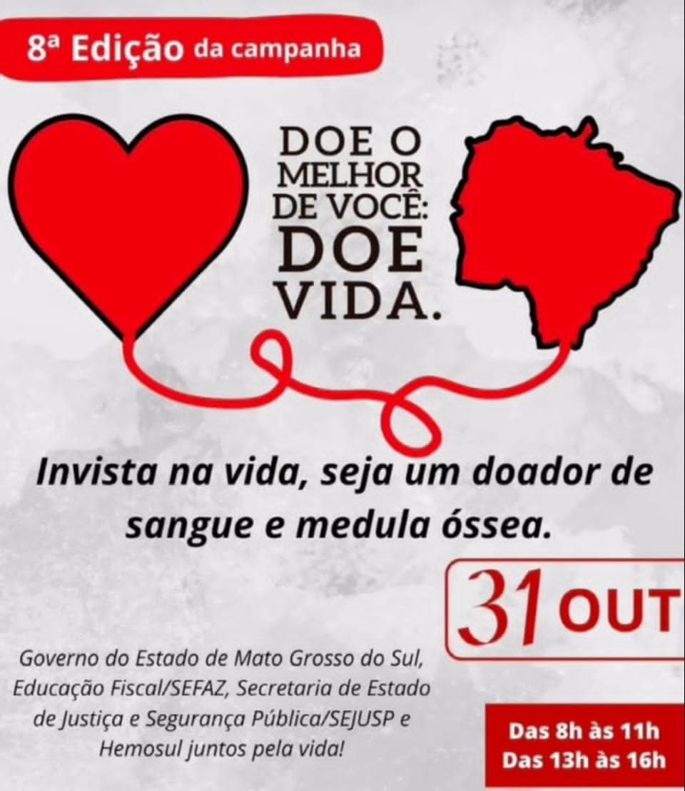 Acontece nesta terça-feira, 31/10, a 8ª Edição da Campanha “Doe o Melhor de Você. Doe Vida”. O objetivo é conseguir o maior número de doações de sangue e cadastro de medula óssea, para abastecer o Hemosul e desta forma salvar a vida de quem precisa.