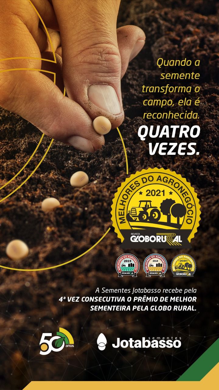 A Sementes Jotabasso vence pela quarta vez o prêmio da categoria Sementes do evento Melhores do Agronegócio promovido pela Globo Rural em parceria com o Serasa Experian. A premiação ranqueia as principais empresas em 21 setores do agronegócio, levando em consideração os indicadores econômicos, como receita líquida, ativo total e margem líquida.
