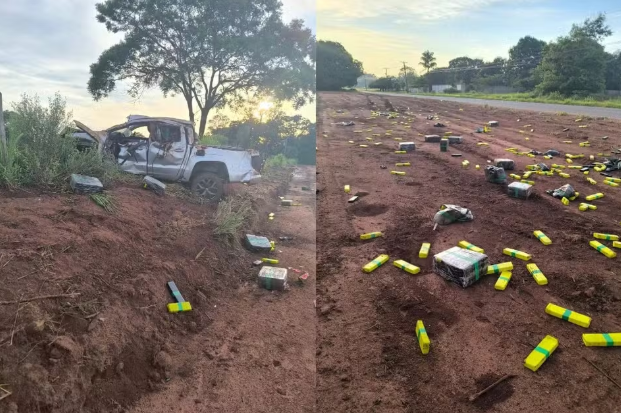 Conforme o Boletim de Ocorrência, a Polícia Civil foi acionada por volta das 5h. No local, os agentes encontraram a caminhonete capotada, a vítima e os fardos de droga espalhados pela rodovia.
