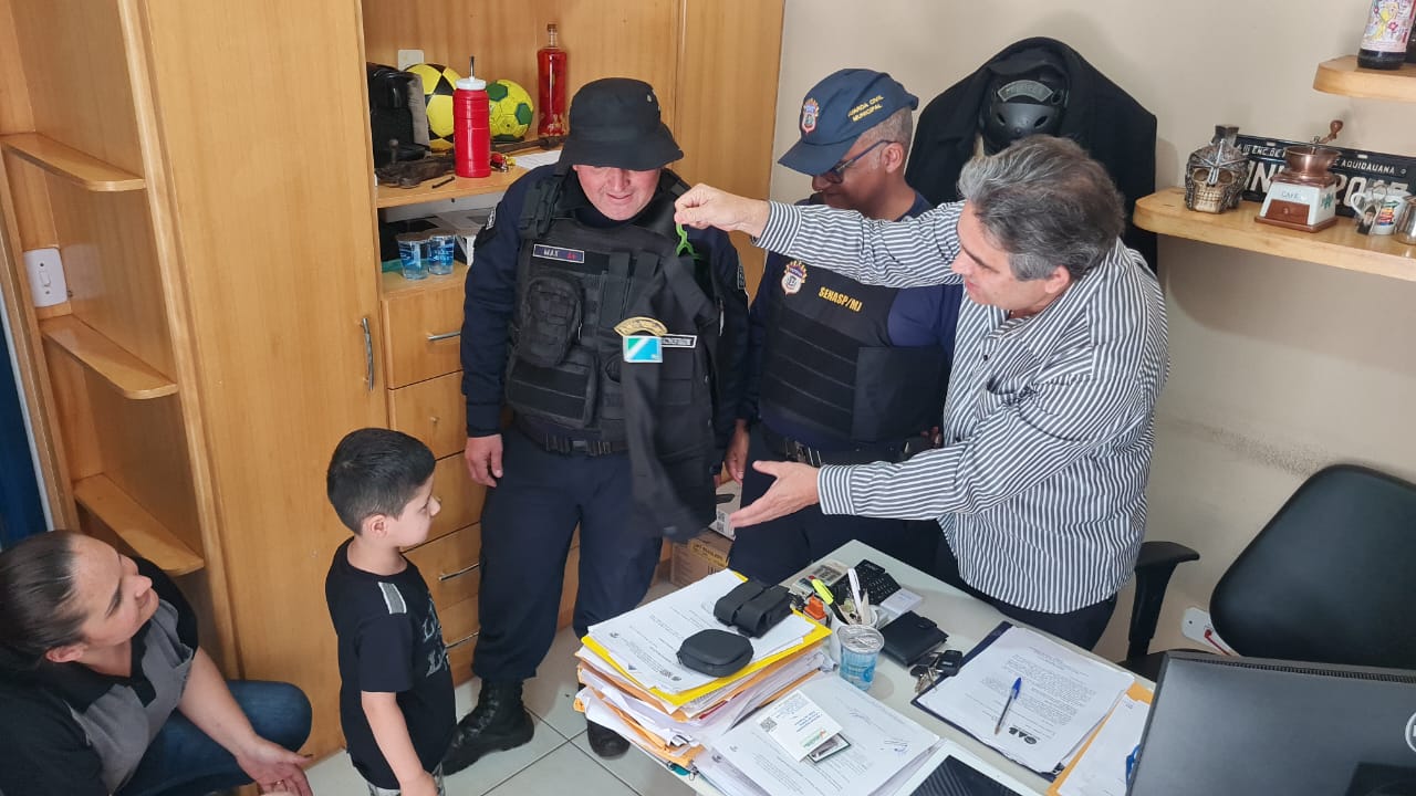 Quarta-feira 09/11/2022, hoje pela manhã, compareceu na Base da Guarda Civil Municipal de Fronteira a mãe, Cristiane Cardoso, familiares e o pequeno M. Henrique (04) que sonha em ser um GCMFron. A criança pousou para fotos e vídeos ao lado da mãe Cristiane Cardoso, com o Comandante Gomes, Subcomandante Luiz Carlos, e ao receber das mãos do Secretário Mun. de Seg. Pública Marcelino Nunes de Oliveira, como presente de aniversário o tão Sonhado uniforme da instituição, o menino se emocionou e chorou.