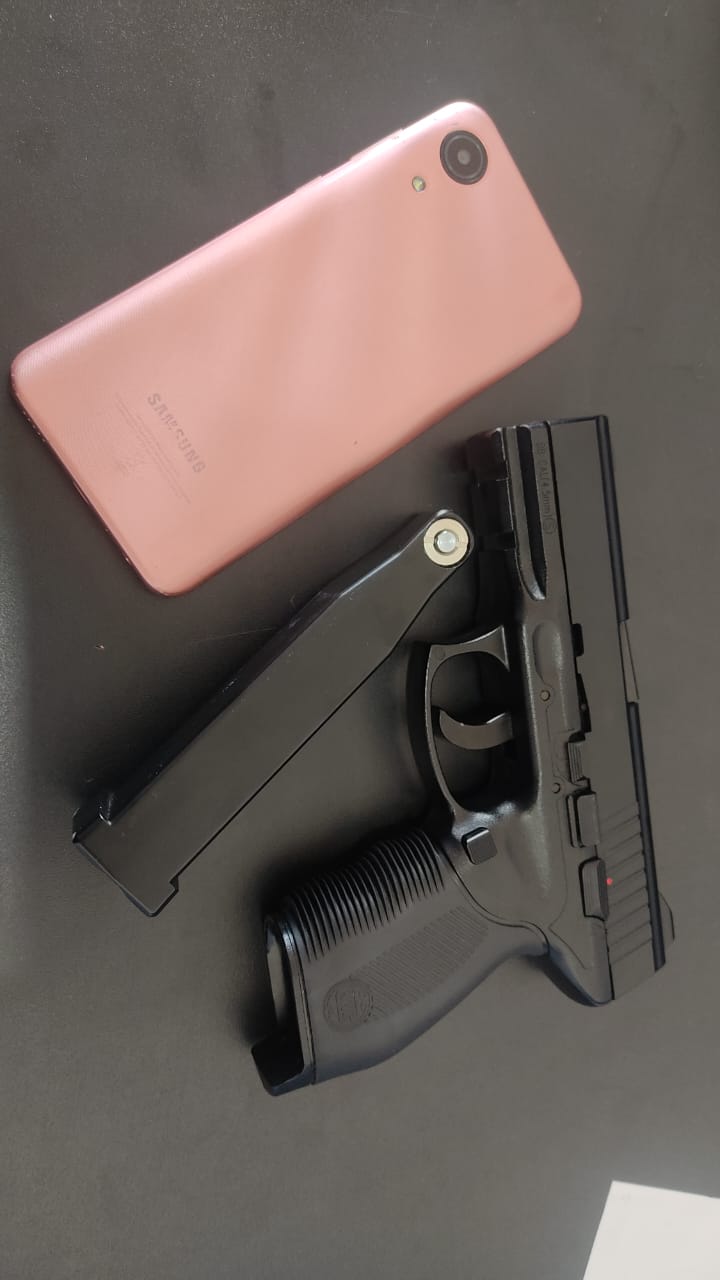 Quinta-feira 31 de agosto de 2023, por volta das 13h02min uma guarnição da GCMFron (Patrulha Escolar) recebeu ligação via telefone funcional para apurar a denuncia de que uma pessoa de sexo feminino identificada pelas iniciais T.M.T. (21) estaria no interior de uma instituição escolar portando uma pistola em sua cintura. De posse das informações a Patrulha Escolar se deslocou logrando êxito em abordá-la na altura da rua Baltazar Saldanha.