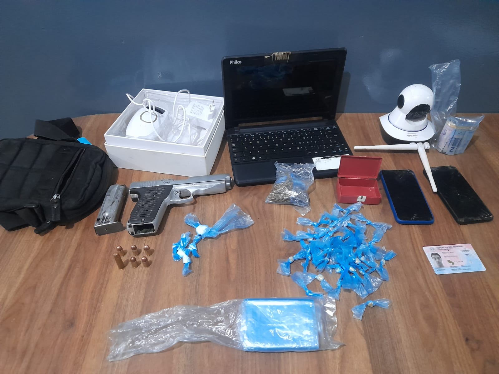 Em buscas realizadas na residência, os policiais encontraram uma pistola calibre 380 com diversas munições, além de porções de cocaína, crack e maconha. Também foram apreendidos dois celulares, um notebook, um depilador e uma câmera de vigilância, que, segundo o autor, foram recebidos em troca de drogas.