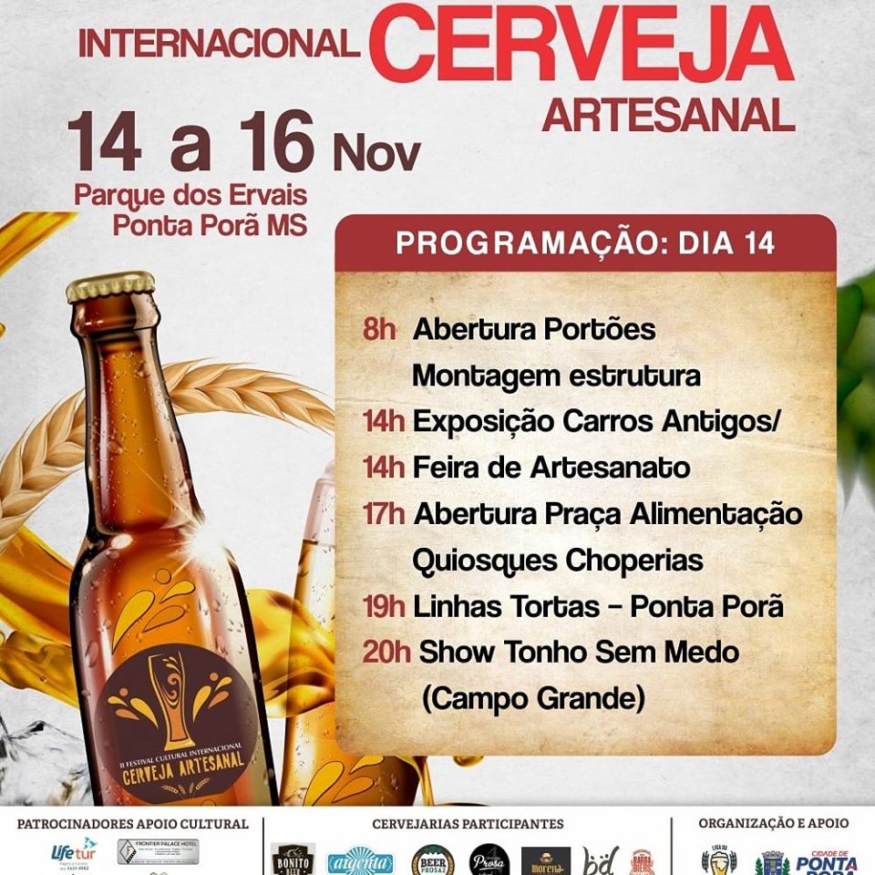 Ponta Porã será palco da 2ª edição do Festival Cultural Internacional de Cerveja Artesanal que acontece entre os dias 14 a 16 de novembro no Parque dos Ervais com realização da Prefeitura de Ponta Porã por meio da Fundação de Cultura e Esporte-FUNCESPP e apoio da Associação de Cerveja Artesanal de Mato Grosso do Sul ACERVA-MS e Liga da Cerveja de Mato Grosso do Sul.