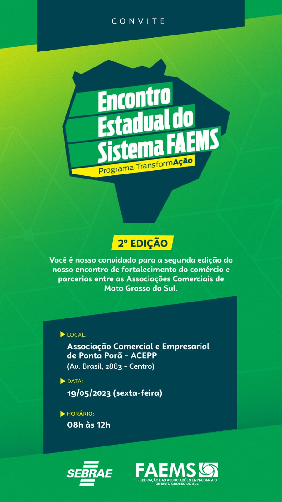 O Sebrae/MS e a FAEMS convidam os presidentes, diretores e representantes das associações comerciais de Mato Grosso do Sul para a reunião do dia 19 de maio, em Ponta Porã, onde irão apresentar boas práticas e iniciativas inovadoras para o associativismo.