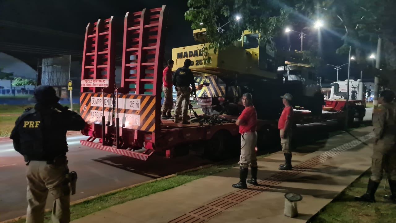 O motorista da carreta que não teve o nome divulgado disse que pegou o guindaste em Ponta Porã e que levaria para São Paulo. Homens da PRF fazem a segurança nas proximidades do quartel do Corpo de Bombeiros na avenida Brasil onde o maquinário está sendo cortado para a retirada da droga.