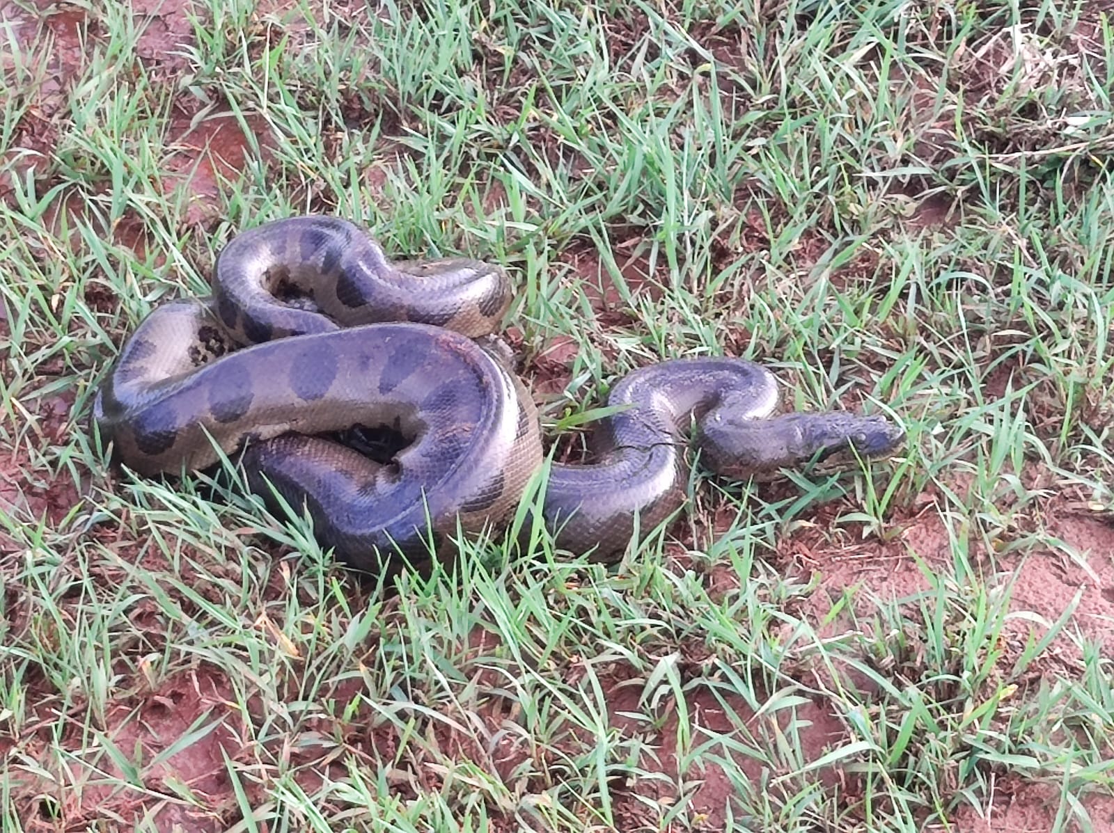 Policiais Militares Ambientais de Mundo Novo foram acionados por uma moradora (43) de uma chácara, ligada a parte urbana da cidade ontem (24) no final da tarde, em razão de haver uma serpente de grande porte nas proximidades de sua residência. Segundo a moradora, devido as chuvas o animal apareceu lá, em local que há movimento de pessoas e precisava ser removido.