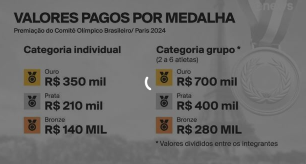 “Como premiação aos medalhistas em Paris, o COB está oferecendo valores cerca de 40% mais elevados aos praticados no último ciclo olímpico. Divididos em três categorias de atletas (individual, grupo e coletiva), as premiações variam entre R$ 1,05 milhão e R$ 140 mil”, divulgou a entidade.