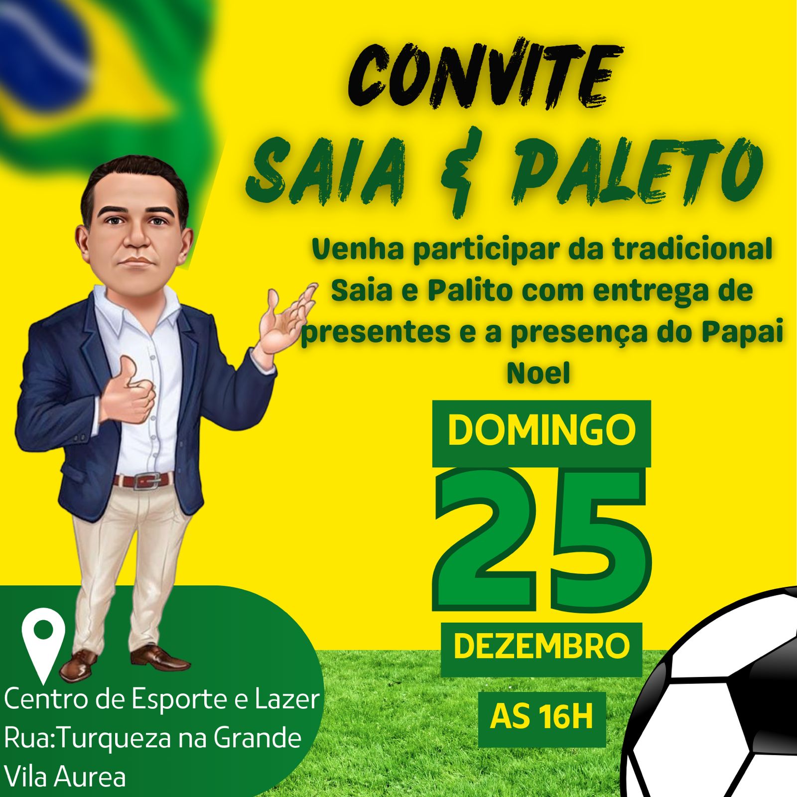 O jogo Saia X Paletó, é realizado pelo Vereador Vanderlei Avelino (Presidente da Câmara Municipal de Ponta Porã) e por um grupo de amigos, com total apoio da comunidade. Durante a festa serão distribuídos 1200 kits contendo presentes para as crianças e 1200 panetones.